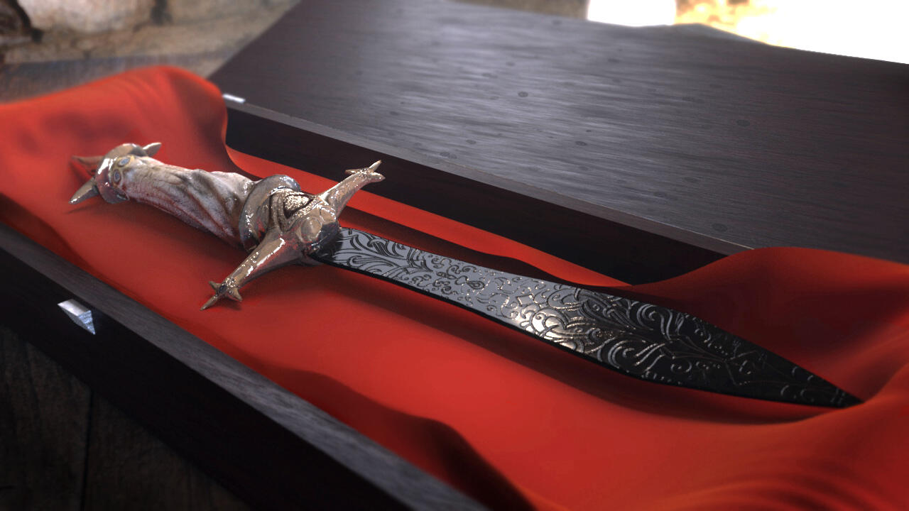 A render in Maya using the Arnold renderer. The knife was sculpted in ZBrush and textured in substance painter before export to maya. It took multiple attempts to get the shine right on the blade so that all the carvings could be seen clearly. As well, the cloth simulation and texture proved to be important for the realism of the final render. Some final touches were done in photoshop.